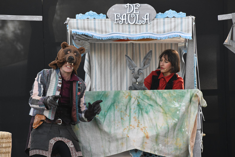 Correcte, un teatrí! És l’espai que ens serveix per la representació dels animals més menuts amb contraposició amb els més grossos que són representats amb les màscares. D’aquesta manera també donem aquesta sensació de diferents volums. A més, també ens aporta molt joc perquè l’anem modificant en funció de la faula que expliquem. És a dir, van entrant i sortint diferents elements visuals a escena i això ens ajuda a mantenir un ritme molt més dinàmic. En definitiva, el teatrí amaga moltes sorpreses!