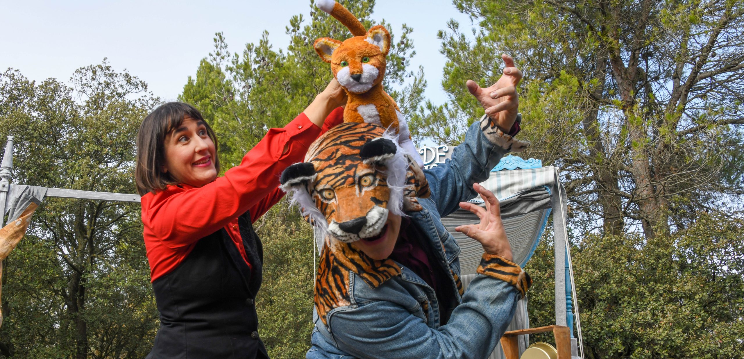 Els animals estan representats per titelles i màscares que hem elaborat nosaltres mateixos per aquest espectacle. I al final els nens i les nenes poden triar un d’aquests animals per fer-se una fotografia i marxar així amb un record de l’espectacle.