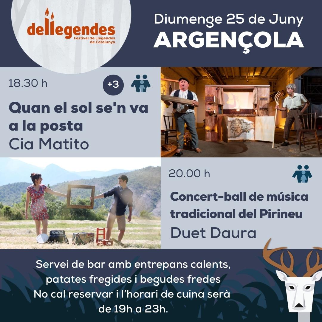 El municipi d’Argençola també serà amfitrió d’aquest tastet del Festival de Llegendes. El seu torn serà el diumenge 25 de juny amb dos espectacles a la plaça Mariano Mestre; a dos quarts de set de la tarda tindrà lloc “Quan el sol se’n va a la posta” de la companyia “Cia Matito” i a les vuit del vespre hi haurà concert i ball de música tradicional del Pirineu amb el Duet Daura.