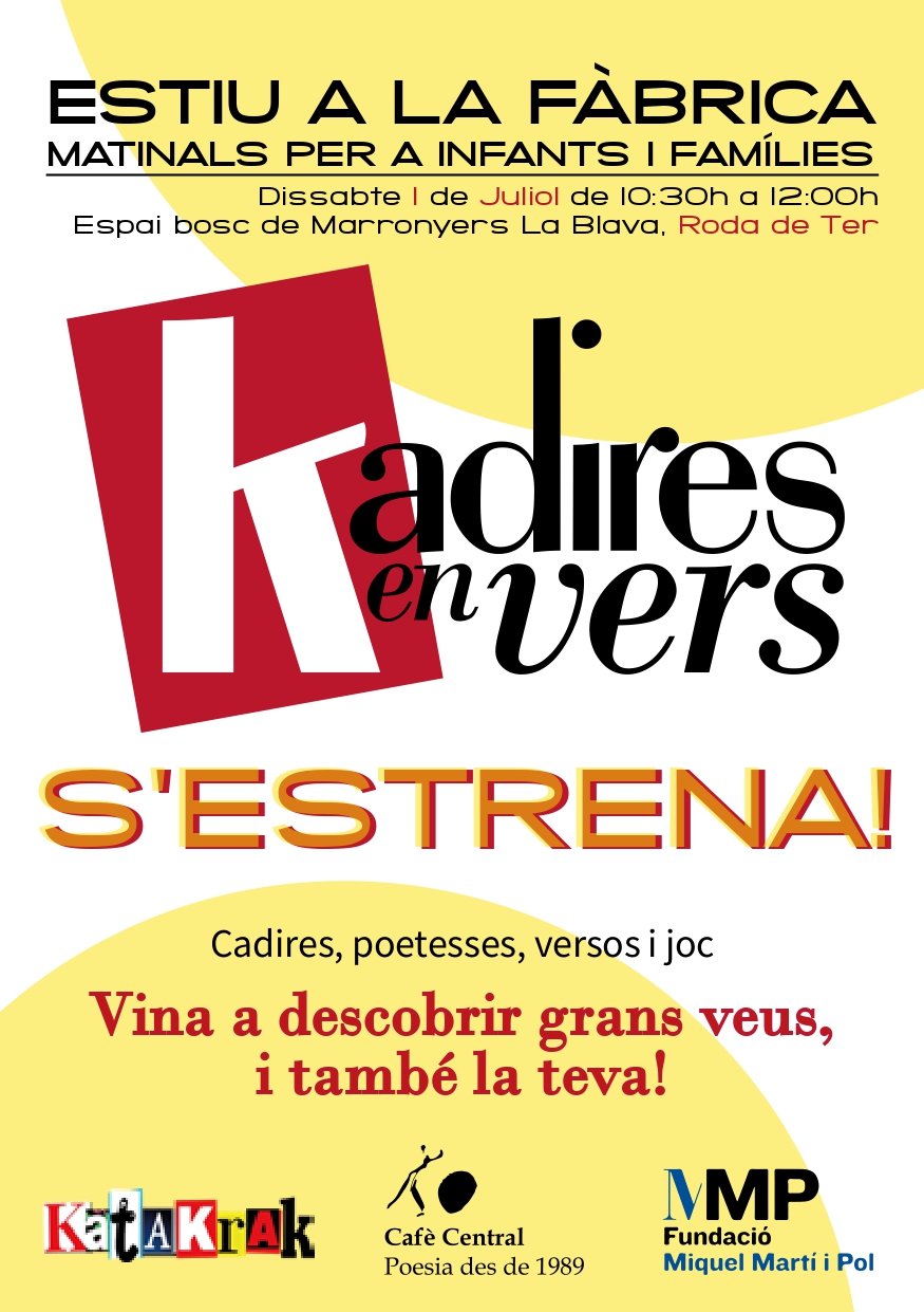 Sota el títol ‘Kadires en vers’ Katakrak presenta aquesta darrera proposta que es basa en vuit espais diferents conformats cadascun per una cadira i una sèrie d’elements on, a través d’una dinàmica, els participants, tot jugant, podran descobrir els versos d’unes escriptores que han publicat la seva obra a l’editorial Cafè Central.