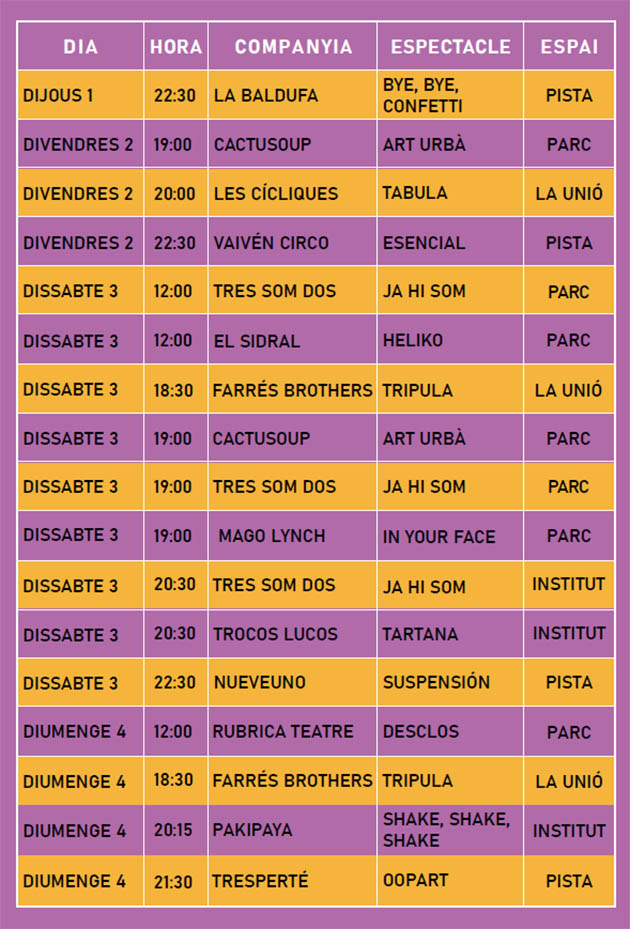 L’edició d’enguany, la vuitena, es celebrarà de l’1 al 4 de juliol -4 jornades és la duració habitual del festival-, el cartell consta de la participació de 13 artistes i companyies, que oferiran fins a 17 funcions dels seus espectacles. També és una novetat que el festival guanya un espai més i ja són quatre. Als espais Parc, Pista i Unió (la sala), s’hi afegeix l’Institut. La pandèmia continua condicionant el nostre dia a dia, de manera que l’organització ja ha anunciat que es prendran totes les mesures sanitàries que hagin indicat les autoritats sanitàries del nostre país.