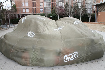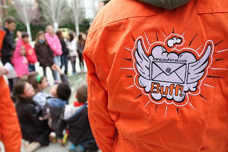Buff! és un espectacle multidisciplinar de plaça amb una estètica ambientada als anys 30. Amb música, animació, jocs cooperatius, danses, gags, curses, pintura mural en directe, cançons… amb un eix transversal transparent: l’aire.