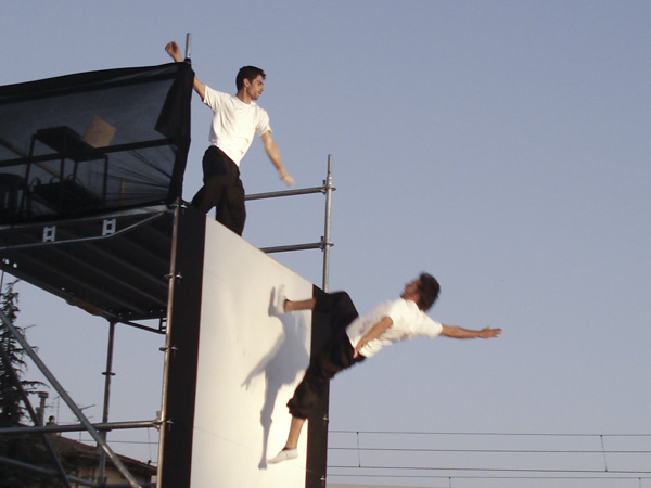 Dos homes suspesos en l’aire es disposen a tirar-se a la piscina amb la seriositat i la rigidesa que assenyala el guió. En un primer moment tot surt com estava previst. Però ben aviat, unes ànsies de rebel·lió s’apoderaran dels protagonistes d’aquesta història.