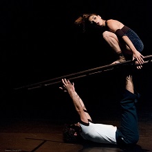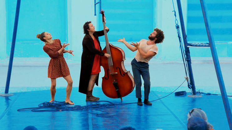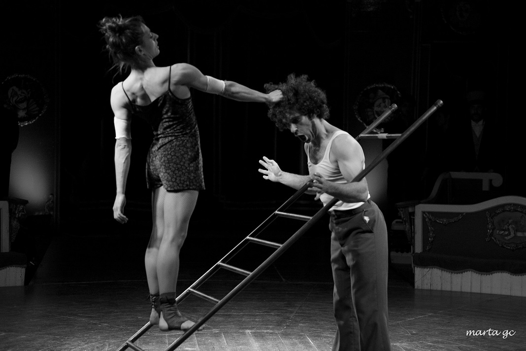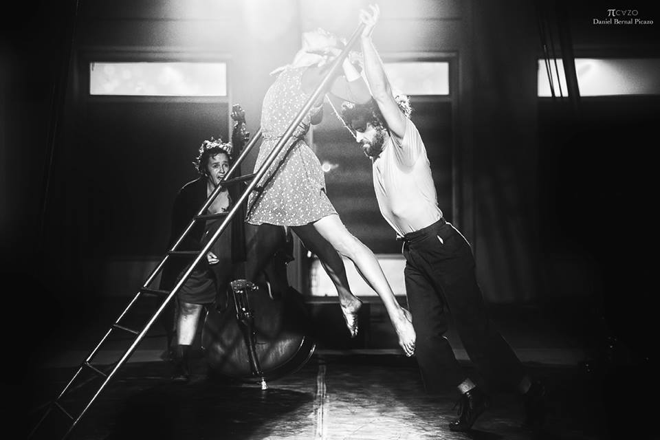 Esquerdes és un espectacle de carrer que combina elements aeris, l’escala d’equilibris i la música en viu a través de tres cossos en moviment en un joc d’estira i arronsa entre el desig de quedar-se i la fugida.