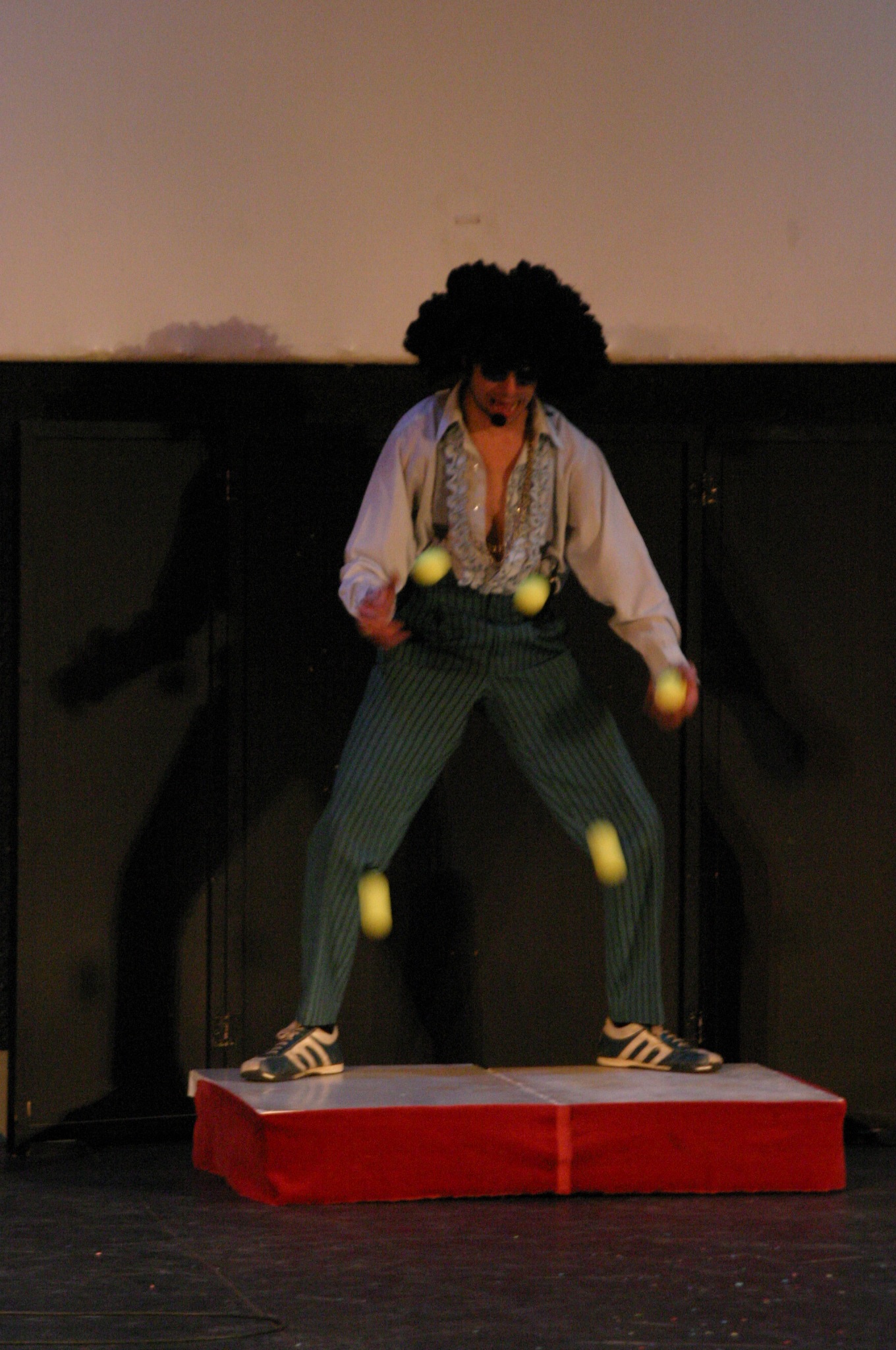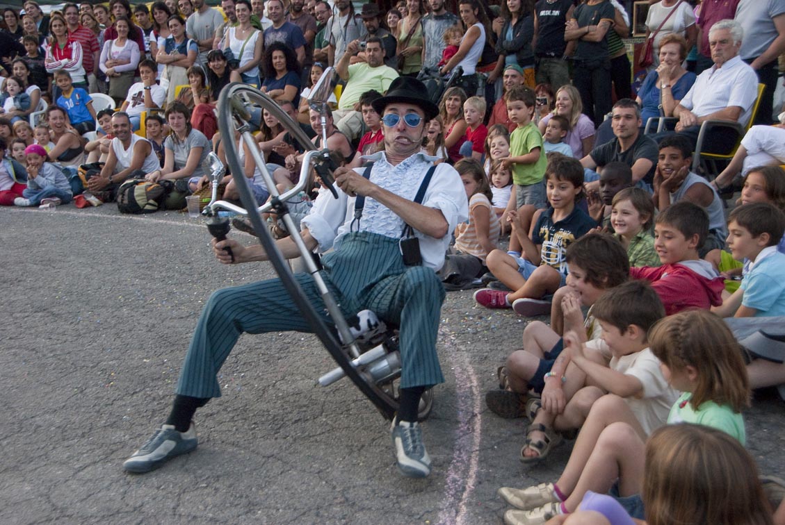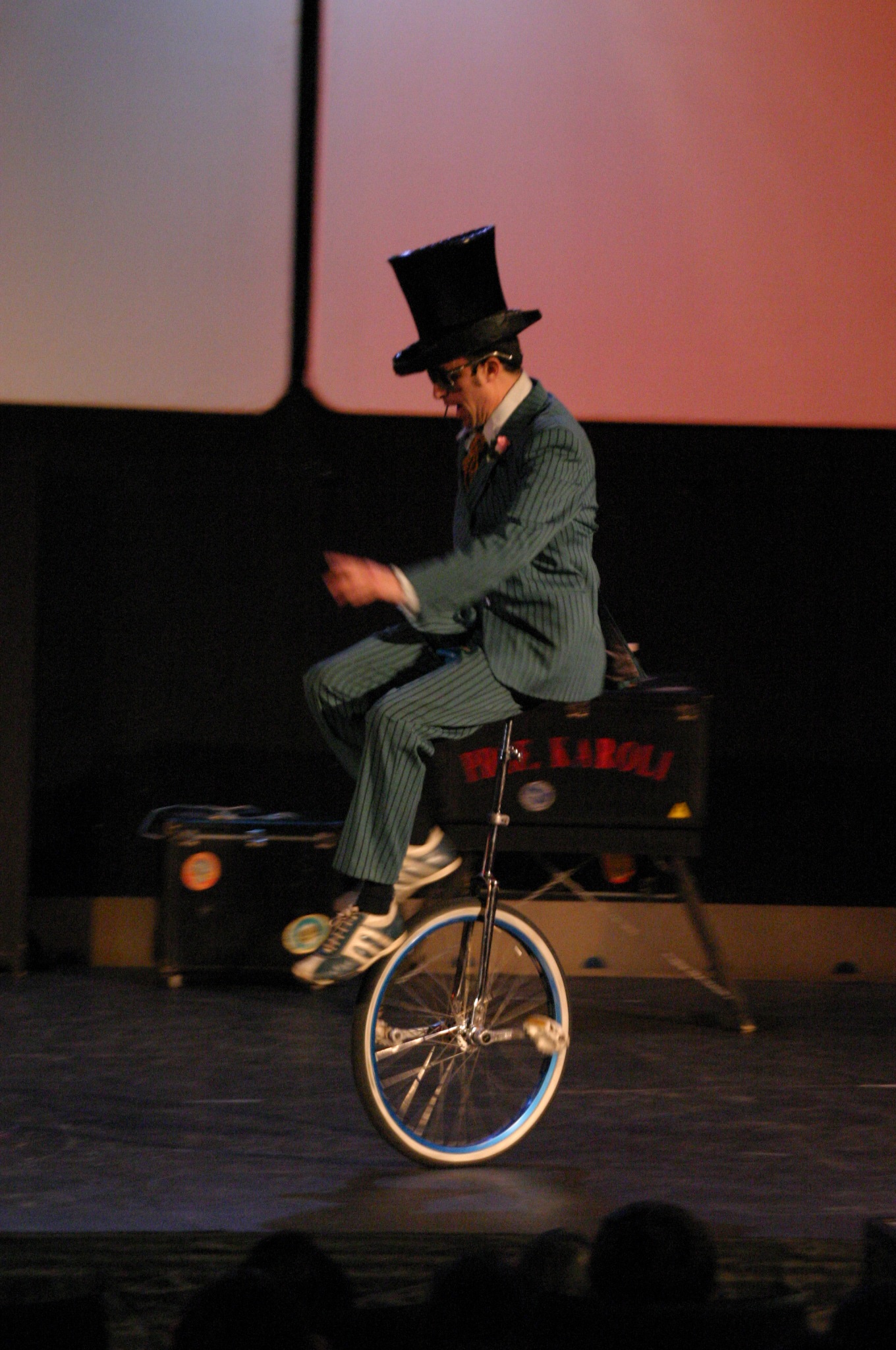 Combinant enginy amb la presentació d’artefactes amb rodes, monocicles alts amb cames, bicis nanes de 10, 20 i 30 centímetres… Karoli demostrarà la seva passió per les rodes fent el mes difícil i, com no!, sobre rodes.