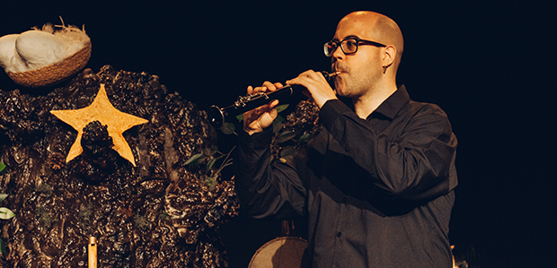 Esther: Pel que fa a l’aspecte musical no ens limitem a fer sonar un instrument cada vegada i prou, sinó que en Sergi tenia al cap fer una aportació a la modernització de la música d’arrel. És per això que utilitzem pedaleres, el músic va gravant les bases i interpreta les melodies corresponents de manera simultània, la qual cosa li ha permès fer uns arranjaments propers a la música electrònica en un parell de temes. Amb tot això sembla que sobre l’escenari hi hagi un grup de músics, però només n’hi ha un. La construcció dels temes es fa en directe, de manera que l’espectacle també té interès pel públic adult, que trobarà un cert nivell de complexitat en la música.