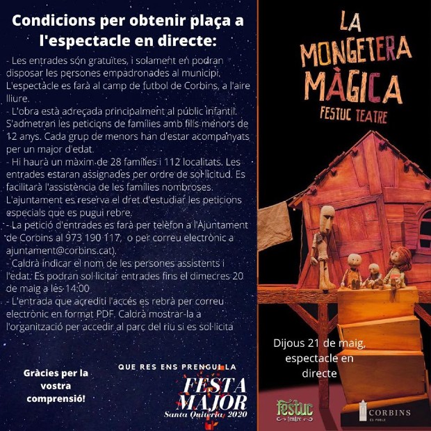 Després de 2 mesos d’aturada, la companyia Festuc Teatre tornarà a actuar dijous vinent amb públic en viu. Festuc farà La mongetera màgica el dijous dia 21, a les 12h del migdia, al Parc del Riu (camp de futbol), amb motiu de la Festa Major de Santa Quitèria. Això és possible gràcies a la confiança que l’Ajuntament de Corbins ha dipositat en la companyia i en els espectacles en viu. Serà el primer ajuntament que programarà teatre en viu dins la fase 1 de desconfinament, un exemple que caldria que s’estengués i servís de precedent per tal que altres municipis programin espectacles en viu.