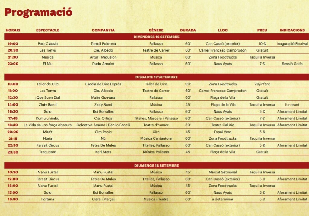 El certamen se celebrarà els dies 16,17 i 18 de setembre i oferirà una programació variada amb espectacles que inclouen disciplines com la música, el teatre de carrer o el clown, entre molts altres! A més a més, els assistents també podran gaudir d’altre propostes com el mercat d’artesanes i d’artesans o foodtrucks.