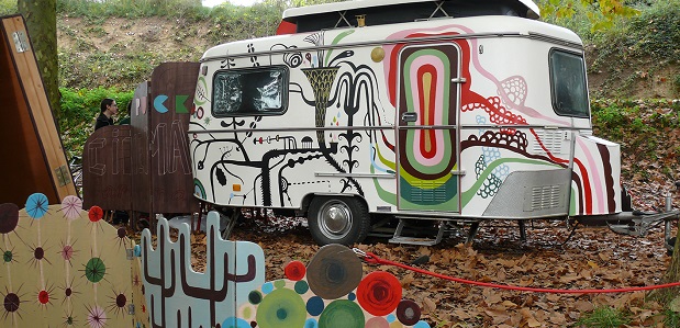 i la seva troupe. Els dos conceptes, el cinema d’animació i les instal·lacions de carrer, es van unir en una proposta única materialitzada en una petita caravana reconvertida en sala de cinema.