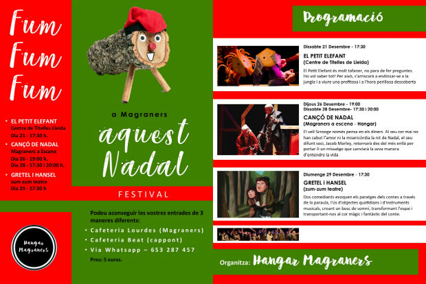 El Petit Elefant (Centre de Titelles de Lleida, dia 21/12 a les 17.30h), Cançó de Nadal (Magraners a Escena-Hangar, dia 26/12, a les 19h, i dia 28/12, a les 17.30h i 20h) i Gretel i Hansel (Zum-Zum Teatre, dia 29/12, a les 17.30h) són els tres espectacles que conformen la programació d’aquesta primera edició del Festival Fum, Fum, Fum. Aquest és només el començament del projecte, explica Ramon Molins, que està convençut que la iniciativa permet mostrar una imatge positiva del barri i que és una manera d’activar-lo. Molins és el director de Cançó de Nadal de Dickens, que posa en escena la mateixa Associació Hangar, una obra que voldria que es convertís en una peça de repertori i la seva representació esdevingui una tradició. Es tracta d’un espectacle fet per amateurs, però treballat amb un gran rigor, mentre que els altres dos espectacles són professionals i de proximitat -les dues companyies són de Lleida-, però la idea és que en el futur hi puguin venir companyies d’arreu, que n’augmenti el nombre i que la programació sigui més completa.