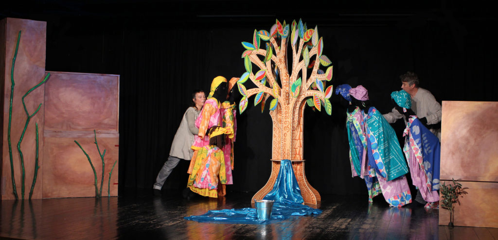 Umbert i Basté van fer un bon treball de recerca i van donar moltes voltes al tema, van adquirir material que els ajudés i poc a poc es van anar amarant de l’esperit de la Wangari. Malgrat això, l’espectacle és relativament senzill d’explicar. Un arbre venerat per les dones d’una tribu africana, que personalitza la natura, és talat per una màquina, que representa el capitalisme, és a dir, la cobdícia, i tot l’entorn se’n ressent, però aleshores arriba la Wangari i es proposa lluitar contra les desforestació i torna a plantar l’arbre, refent l’ecosistema, que recupera l’equilibri i l’harmonia entre la natura i l’home. “És un espectacle complicat de fer –explica Nona Umbert-, perquè pensant en els nostres petitons has de netejar molt, però també estàvem pensant en infants una mica més grans, perquè també és un espectacle adequat per ells, malgrat que el ritme és de primera infància. Tampoc ens agrada, però, posar etiquetes molt tancades. Les vegades que l’hem fet els més petits han seguit la peça fascinats pel moviment i els colors, mentre que els més grans ja l’entenen”.