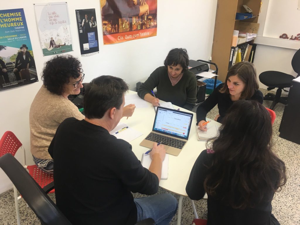 L’equip de Zum-Zum Teatre, fent treball de despatx, amb Margarida Troguet.Anem al tema territorial. A Lleida hi ha una gran concentració de companyies i unes quantes són referents, ja no només catalans i a l’Estat, sinó també europeus. Com s’explica?