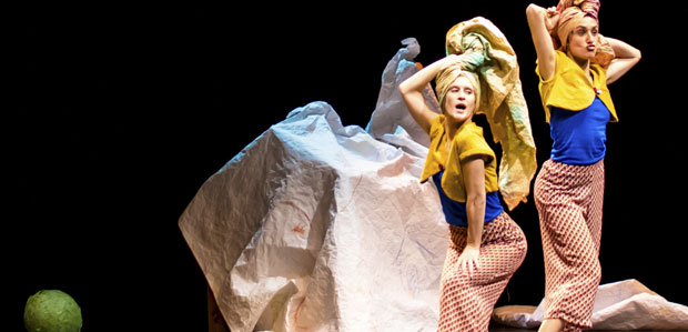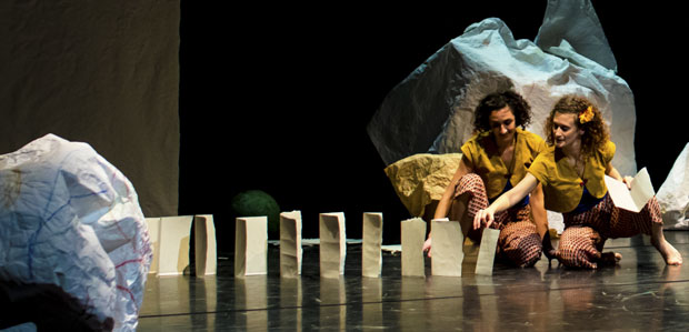 A Moreso també li encaixava l’ús que se’n fa a nivell de disseny i decoració, ja que Wabi-Sabi parla d’elements senzills, molt bàsics, com ha fet ella en treballar amb la bola de paper com a base. L’escenografia es basteix a través d’un vídeo previ en què es veu l’interior d’una paperera. En surten uns personatges que es desfan dels embolcalls de paper que els cobreixen per anar descobrint, una rere l’altra, diferents boles de paper. “Vaig investigar les possibilitats que m’oferia el paper com a element a partir d’una idea que tenia al cap en haver vist una nina feta tota de paper. I de la mateixa manera que creem nines de paper, creem barrets, i un vestit… Dels trossos de paper estripats en surten coreografies, sons i imatges de vídeo que expliquen històries d’ocells, de vaixells, de cuina…”.