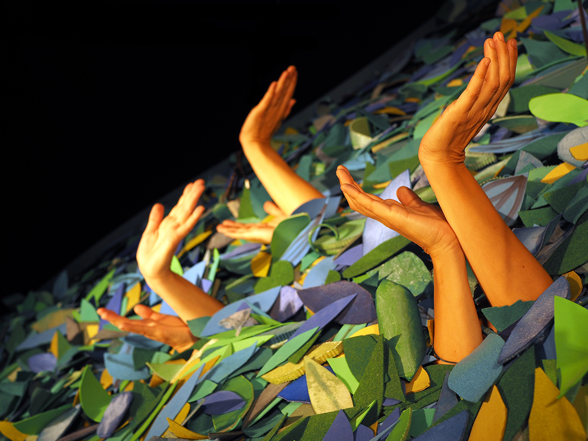 Sotabosc és el que hi ha sota dels arbres i havíem de pensar en una estructura que s’elevés i que l’acció passés a sota d’aquesta. Al principi de l’espectacle sembla que no hi hagi res, només les fulles caigudes dels arbres. El terra és la unió entre el que ha caigut perquè ja és mort i aquesta pròpia descomposició crea vida i per tant allà també és on comença a brotar tot. I a mesura que avança l’espectacle sorgeix la vida i l’espai escènic s’omple de joc.