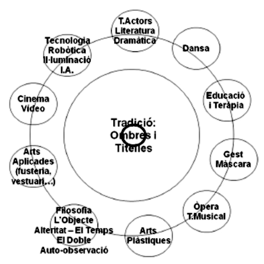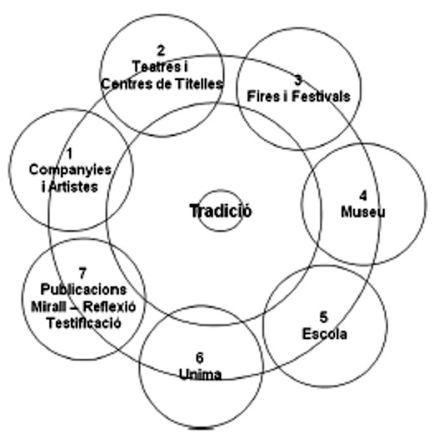 El primer que es van plantejar, va explicar Rumbau, és com definir el sector: “És un aspecte que aixeca molta controvèrsia i hi ha fins i tot qui dubta de l’existència del sector. Aquest, només són els titelles? Però i els objectes? I el teatre visual? I què és el teatre visual? El que defineix el sector són només els titelles?”. La utilització de les paraules presentava massa complexitat per definir-lo, de manera que l’autor de l’estudi va optar per una imatge, un diagrama de cercles concèntrics, una manera clara i neta de definir el sector. En el centre d’aquest diagrama s’hi situa la innegable tradició d’ombres i titelles. “Totes les cultures tenen la seva tradició específica de teatre de titelles i objectes –explicava Rumbau-, i és un sector amb la tradició molt clara i molt viva, per això ocupa el centre del dibuix. I al voltant s’hi situen, més o menys allunyats, aquells llenguatges artístics que s’inspiren i es reflecteixen en la tradició d’una manera directa o indirecta, els que la tenen com a referent. I més allunyats encara hi ha els espais d’hibridació, perquè no oblidem que aquest és un sector que tendeix a la hibridació amb altres tècniques o arts, i això és positiu, però també espanta a aquells que volen preservar inalterada la tradició per tal que no es perdi”. Rumbau aposta per perdre la por a la hibridació i a la pèrdua de la tradició, perquè malgrat que hi ha innovació la tradició “és viva” i el sector admet els extrems, els festivals especialment, ja que en els seus programes hi conviuen sense problemes tradició i avantguarda, demostrant que el sector és elàstic i ric.