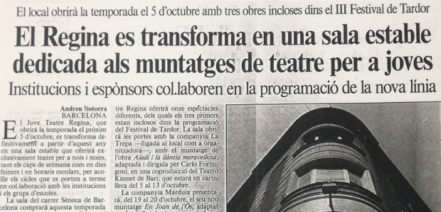 Quan a la tardor de l’any 91, el Jove Teatre Regina va decidir dedicar-se exclusivament al públic infantil i juvenil, un dels titulars de la premsa catalana va ser: «Se pierde un teatro en Barcelona». Aquesta frase, impensable ara mateix, era un símptoma de la necessitat que hi havia de reivindicar espais per a companyies de teatre familiar. «Sentim molt orgull d’haver contribuït a que el teatre sigui una opció com una altra d’oci familiar, que la gent pugui comptar amb el teatre per fer alguna cosa el cap de setmana amb els nens i nenes», diu l’actual directora del Regina, Mariona Campos Solé. El Teatre Regina portava 3 anys en funcionament quan l’equip impulsor amb Agustina Solé -mare de la Mariona- al capdavant, va decidir dedicar la seva activitat a la programació estable per a infants. «Per mi és com un germà petit», diu la Mariona rient. Però no és broma! La seva família, creadora de la companyia de teatre infantil La Trepa, portava 10 anys d’activitat quan al 1988 es va decidir a agafar les regnes del Regina, que portava mesos tancat. D’això fa 30 anys. Primer, amb programació que combinava nits de teatre per a adults i caps de setmana per a tots els públics. Però sempre apostant per una temporada estable d’un tipus d’espectacles que en aquell moment eren «coses de pallassets», com recorda la Mariona. «En aquell moment, no érem tan conscients de les necessitats del sector, perquè no era un sector com a tal, però volíem que es respectés el teatre».